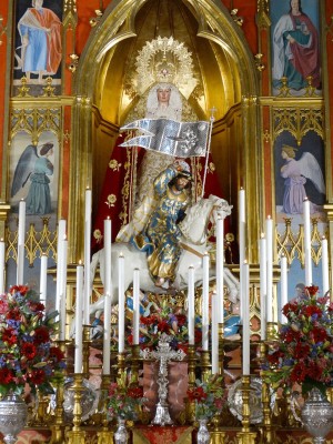 El altar efímero dispuesto por la priostía de la Hermandad quedó establecido en el altar mayor, a los pies de la imagen de Nuestra Señora de la Soledad. La imagen ecuestre del Santo Patrón, que lucía espléndida tras los recientes trabajos de conservación llevados a cabo por N.H.D. Manuel Luque Posada, portaba la nueva bandera plateada y estrenaba la aureola, que al igual que la banderola ha sido realizada por Orfebrería Andaluza. Igualmente se estrenaba la peana de la bandera, preparada ya para futuras salidas procesionales de la imagen, realizada en madera policromada por Óscar Caballero (labor de talla) y nuestro hermano Manuel Luque (policromía).