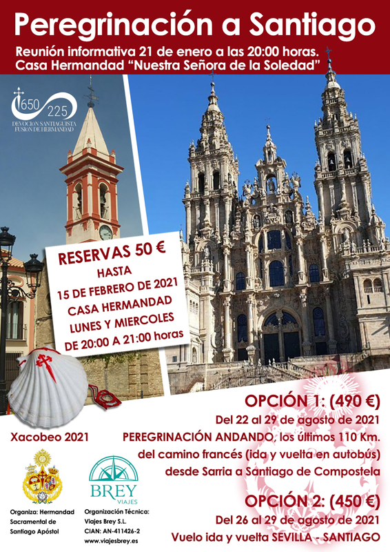 En la actualidad, la junta de gobierno presidida por D. Francisco Luque González se encuentra inmersa, a través de una comisión de hermanos creada al efecto, en la organización de una segunda peregrinación en la historia de nuestra corporación con motivo del nuevo Año Santo que iniciamos ahora. Con importantes novedades con respecto a la organizada en 1999, se pretende llevar a cabo en la segunda quincena del próximo mes de agosto en dos modalidades: una, de viaje directo a la capital gallega y otra, donde se realizará caminando el último tramo del Camino que se exige para recibir la Compostela.