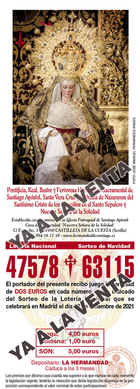 La Hermandad Sacramental de Santiago Apóstol vuelve a poner a disposición de los hermanos y devotos, un año más, los números de la LOTERÍA DE NAVIDAD 2021.