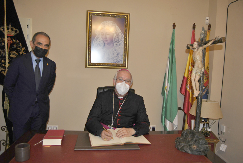 Por último, Monseñor Saiz Meneses dejó su firma en el libro de visitas de la Hermandad, posando en varias fotos con los representantes de distintos grupos de la corporación allí presentes.