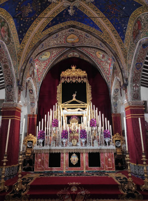 El altar efímero instalado para la ocasión por la Priostía de la Hermandad estuvo presidido por el Santísimo Cristo de los Remedios en el sepulcro, dispuesto para la ocasión a una altura elevada. Sobre varias gradas se dispuso candelería con cera de color blanco distribuida de forma piramidal. En la parte superior se encontraba la imagen del Señor de los Remedios en una nueva urna que se estrenaba para estos cultos. El dosel que remataba dicho altar era el de la Hermandad con un fondo de terciopelo de color negro. A los lados se colocaron dos credencias con cuadros. El conjunto lo completaba un juego de ochos jarras con una combinación de flores en tonos morados. Dicha composición estaba formada por calas moradas holandesas, clavel cardenalicio colombiano, estati morado, esparraguera y flor de cera morada.