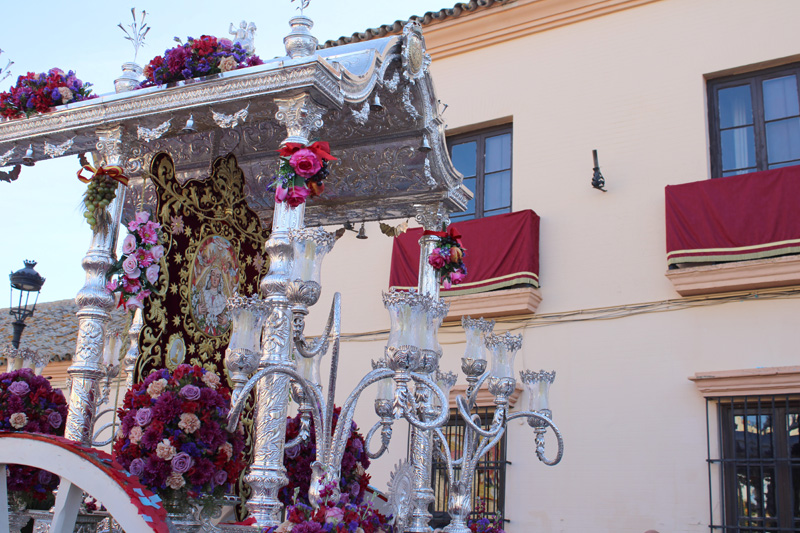 La Virgen lucía muy hermosa, escoltada por los cuatro arcángeles, vestida con las galas propias de esta jornada (ráfagas, cetro, ramillete de azahar, media luna, corona de plata, saya blanca y manto rojo). Además de numerosas joyas, la cintura de la Virgen se ceñía con el fajín militar rojo y estrenaba pecherín bordado en oro. Las flores que exornaban el paso fueron las siguientes: rosa mundial holandesa de color blanco, flor de cera rosa, estatis malva y hojas de camelia.