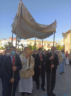 Una vez finalizada la Eucaristía dio comienzo la tradicional Procesión Eucarística con Su Divina Majestad bajo palio por la plaza de Santiago, acompañando musicalmente la Banda Municipal de Música “Fernando Guerrero”, de Los Palacios y Villafranca.